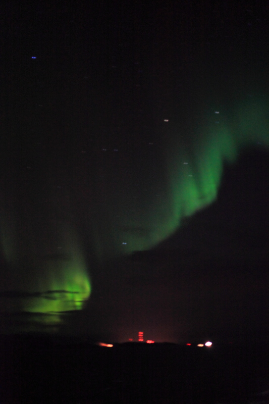 オーロラ帯初日、「オーロラ!オーロラ」の声にデッキに上る。あそこですと言われるがよくわからない。添乗員は見れてよかったというがだまされた感じ。2日目、ラウンジで休憩していたらオーロラの船内アナウンス、船首で小さいがきれいなオーロラが見える。3日目、「オーロラ!オーロラ」の声に船尾デッキへ規模の大きなオーロラが出現、緑色も濃い!きれいだ。見れてよかったよかった。