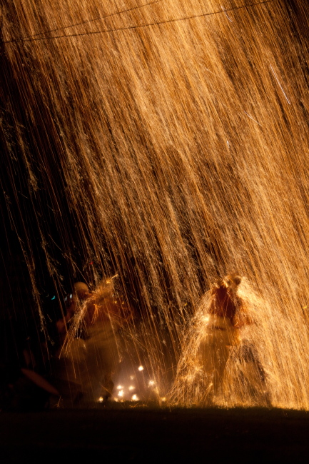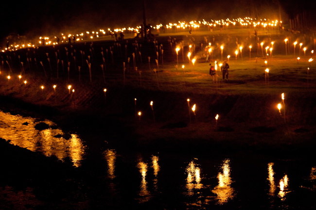 儀式は10数名の松明を持った男集の登場から始まる。男たちは次々に松明(タイマツ)に火が灯す。いつのまにか松明をもつ一団が後ろからあらられ、鉦の音が鳴り響き幻想的な雰囲気が漂い始める。