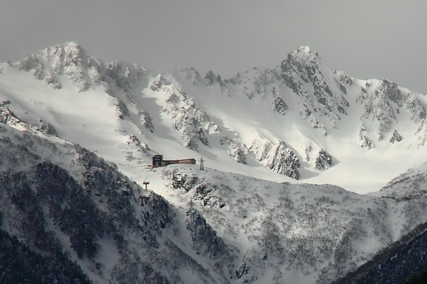 左の写真は、下山してからの宝剣岳と日本一高い場所にある宿泊した千畳敷ホテルの遠景である。