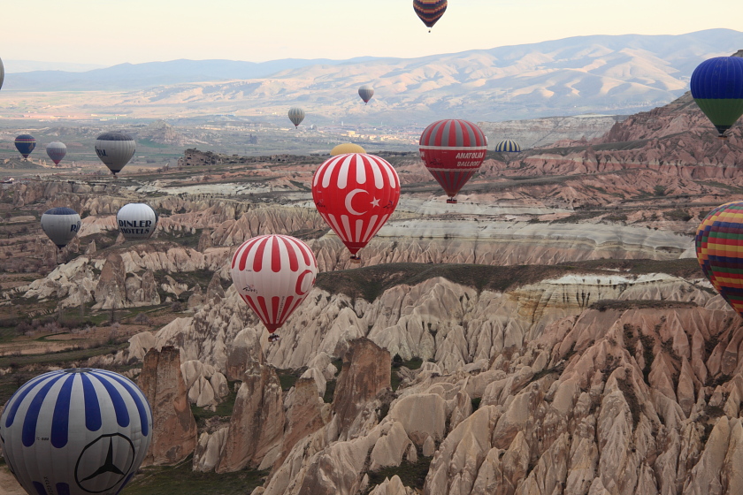 ローズバレイは、夕日があたると赤く染まることで知られる。ここは有料で1人2TL必要である。初日はダメだったが二日目は夕日に染まる奇岩に出会えた。朝景は、気球ツアーで日の出に合わせ空から奇岩地帯を撮影した。カッパドキアの奇岩群に近づき(降下して)さまざまなきのこ岩、洞窟、ブドウ畑などが空から楽しめる。宿泊ホテル送り迎えで2万円だった。すばらしい体験・感動だった。ぜひお勧めする。