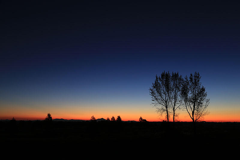 春は野焼きの後だったので整然としていたが、11月はヨシ原にトラックやクレーンが入って整備をしているので撮影が難しかった。朝景は春と同じ場所から撮影した。北エンタランスから入りゴルフ場のほうへ土手づたいに10分ほど歩いた場所だ。左の写真は、日の出30分前のものでこの時間帯が一番好きだ。空は黒から青へ変わり地平線は赤く染まり始める。みごとな朝景だ。この場所は、遊水地全体から筑波山まで見通せる。大きな木の左側にあるのが筑波山。