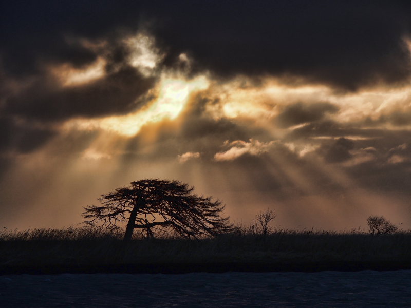 左の写真は、別海町の一本松で「厳しい風雪に耐えてきたった一本の松」らしい。悪天候にもかかわらず、日が差した一瞬の風景。