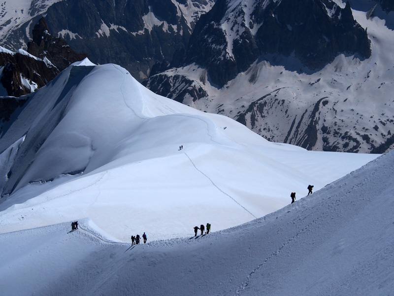 ローザンヌからレマン湖を渡りフランス側ののシャモニーへ移動。ロープウェイにて、エギーユ・ドゥ・ミディ展望台からモンブランの雄姿をお楽む。この展望台を基点として縦走するハイカーが多い。ふもとではサマーキャンプの子供たちがロッククライミングに挑戦していた。