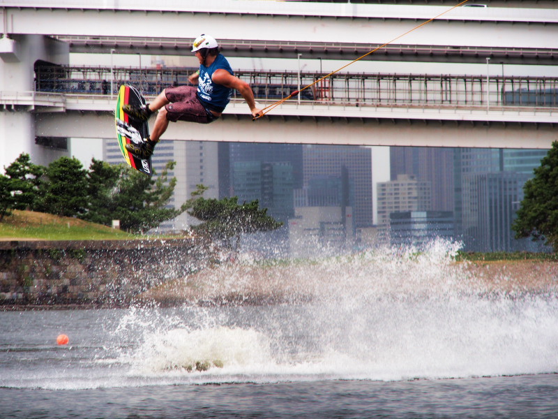 ウェイクボードの世界大会がお台場で開催されたので出かけた。今回はケーブルウェイクボードで従来のようにボートで牽引されるのではなくてお台場海浜公園特設会場に設けらえた5本の支柱に張ったケーブルをモーターで回転させ、牽引する。
