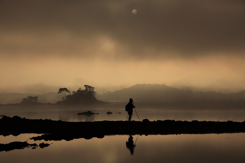 我々(キヤノン)ほかにハッセルブラッドのグループが撮影していた。刻々と光が変わる墨絵の世界を我々はバチバチ撮っていたが、ハッセルブラッドの方は、最高の瞬間までシャッターを押さない。うーん我慢強い。真似できない。7時ごろまで撮影し数百枚撮った。帰り途中で振り返るとまだ頑張っている仲間がいたので撮ったのがこの1枚。早朝の桧原湖よかった。