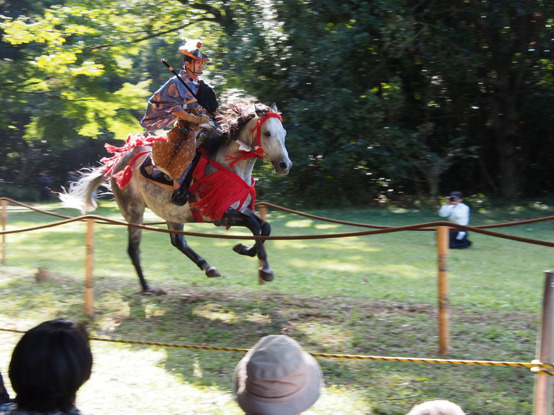 広い境内で同時に行われているので、流鏑馬を中心に撮影した。10時ごろに馬馴らしが行われ、14時ごろから華麗な流鏑馬装束に身を包んだ射手(いて)が登場する。武田流弓馬道のため伝統にのっとった厳格な規則に従って執り行われる。『天下泰平、五穀豊穣、万民息災』の願文を奏上し、流鏑馬が開始された。