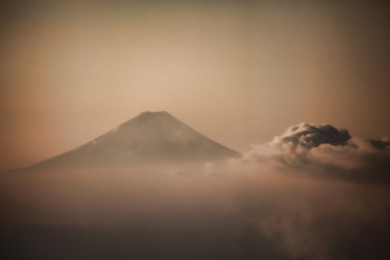 まだ真っ暗な時間帯だが先客が10名ほどいる。諏訪湖・八ヶ岳・南アルプス・富士山などが展望できる草原の山頂だが、諏訪湖から立ち上るガス(雲)が邪魔して雲海に浮かぶ富士山が見えない。雲が薄くなったときにに撮ったのがこの1枚。