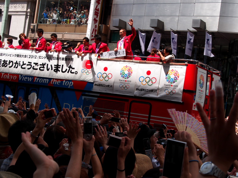 ロンドン五輪で史上最多38個のメダルを獲得した選手たちによるパレードが20日、都内・銀座で行われ、約50万人(主催者発表)が沿道を埋め尽くした。メダリストたちはオープンカーやバスに乗り、集まった人びとから歓声を受けた。